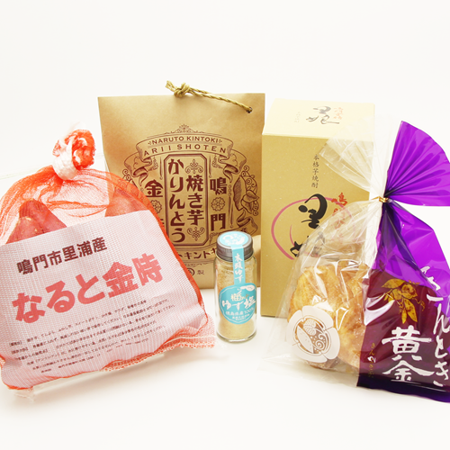 鳴門金時のほのかな香りと甘みが堪能できるお酒の「里娘」、焼き芋ペーストを生地に混ぜ込んだ、上質な芋の香りが際立つ「焼き芋かりんとう」、パリッとしっとり食感がやみつきになる「きんとき黄金」、徳島県産阿波のブランド芋「なると金時」、爽やかな柚子の風味香る「ゆず塩」を詰め合わせたセットです。